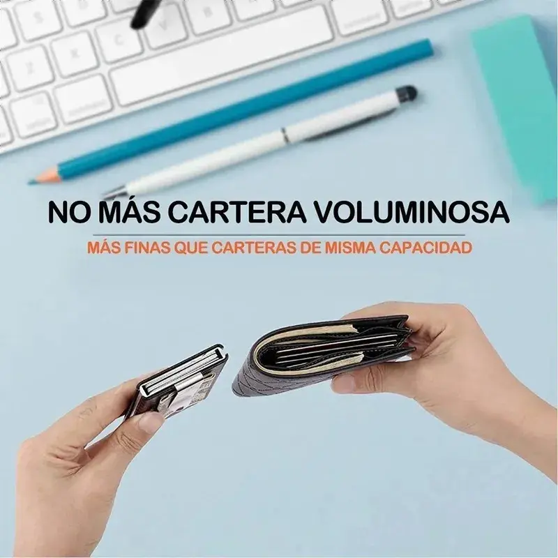 Tiene capacidad para 5 tarjetas 2 identificación , dividido de la siguiente manera 1 soporte para tarjetas emergentes para 4-6 tarjetas, y 2 ranura de identificación o licencia de conducir, además de 1 compartimentos para dinero en efectivo,